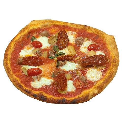 pomodoro, bocconcino di bufala, pomodorino giallo, salsiccia, porcini, origano, pomodori secchi